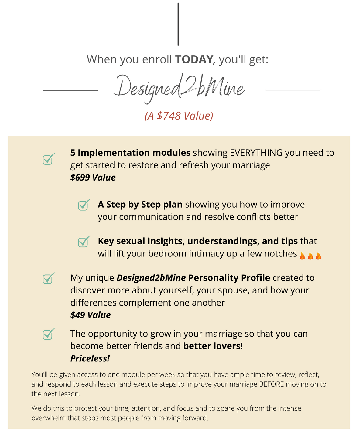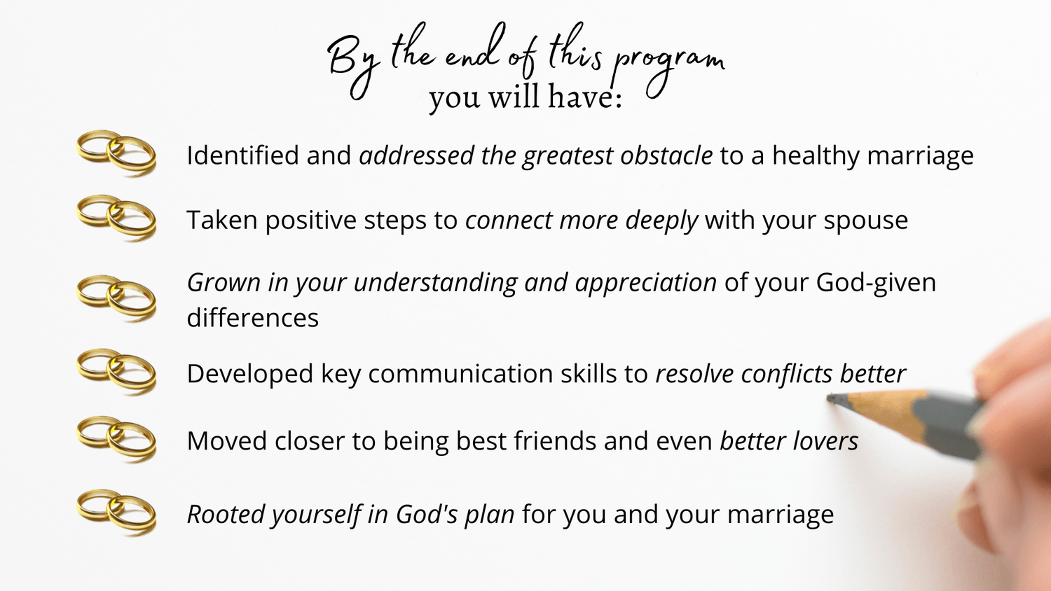That's why you're motivated to invest the next 5 weeks for the next 5, 15, or even 50 years of your marriage! Don't wait!